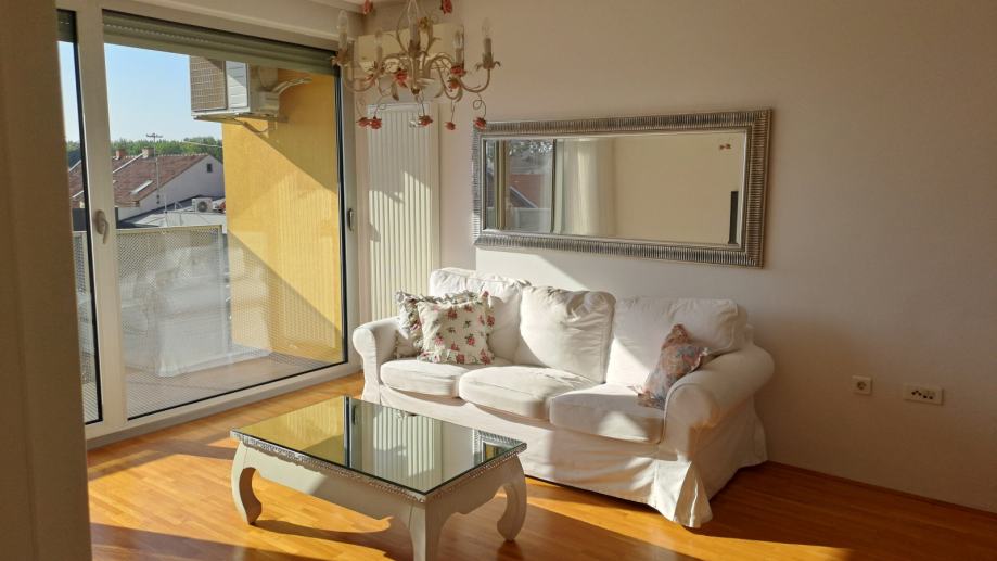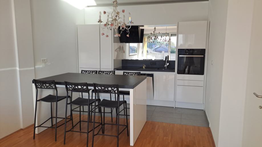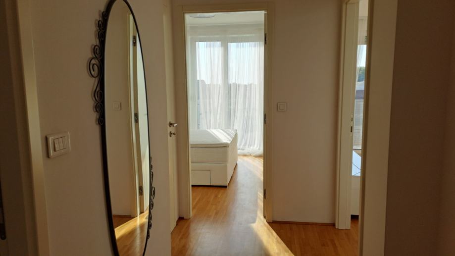 Stan je opremljen protuprovalnim vratima, videofonom,parketom, vrhunskom alu stolarijom s izo staklima,klimom.Grijanje na kondezacijski bojler (manja potrošnja) s radijatorima i lcd automatskim upravljanjem. Stan se sastoji od hodnika,dnevne sobe sa kuhinjom i blagovaonom, spavaće sobe, kupaone, lođe i ostave. Kupaona je prostrana s kadom i velikim ogledalom. U kupaonici se nalazi bojler i mašina za veš marke Beko . Kuhinja je DanKüchen opremljena hladnjakom sa zamrzivačem, perilicom suđa, pećnicom, pločom za kuhanje. Blagovaona se sastoji od modernog stola i 6 stolica.Dnevna soba sadrži trosjed, stolić, komodu, televizor. Spavaća soba sadrži veliki otvoreni ormar, boxspring krevet Amadeus marke Hespo, zavjese i noćni ormarić.Ostava je prostrana s policama. Zahvaljujući vrhunskim materijalima iznimno tiho je u zgradi a režije minimalne.