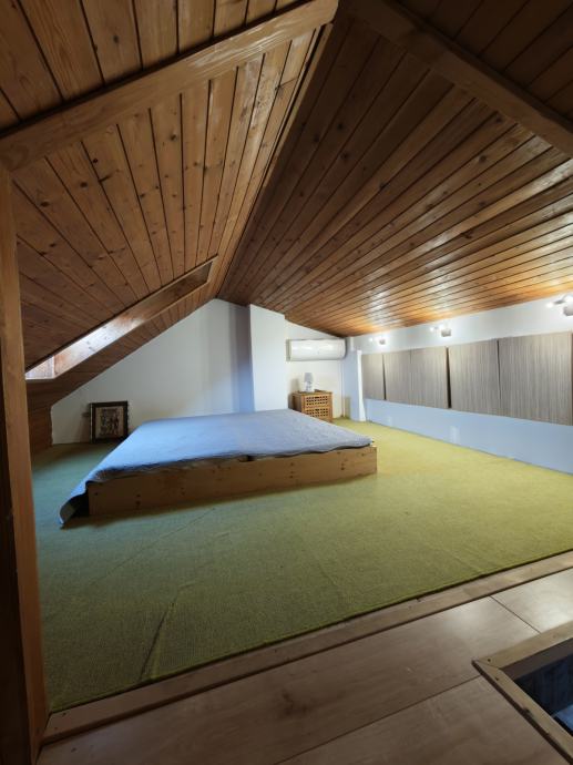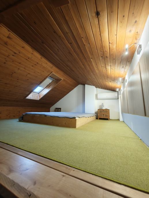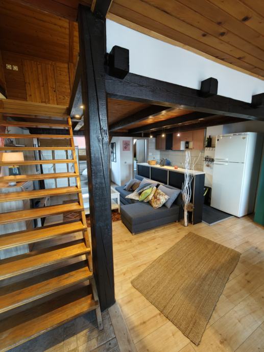Stan je organiziran na dvije etaže – donja etaža površine 45 m² sadrži glavni životni prostor, dok se na gornjoj etaži (12 m²) nalazi spavaća soba koja pruža dodatnu privatnost i ugodan ambijent. Ima zasebni ulaz.