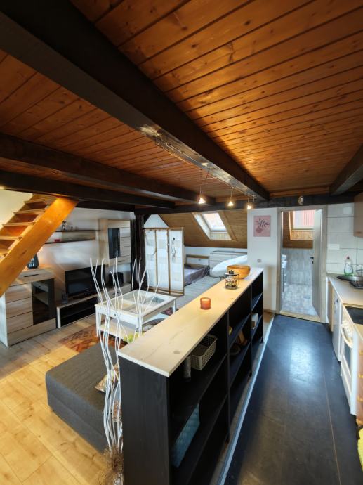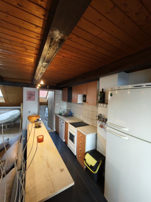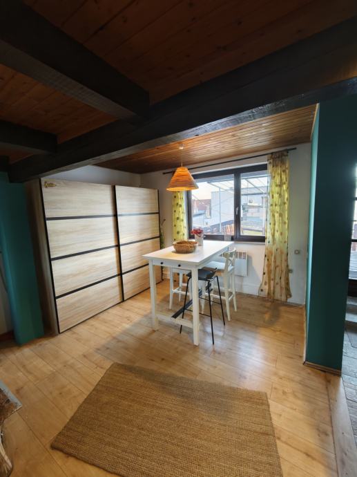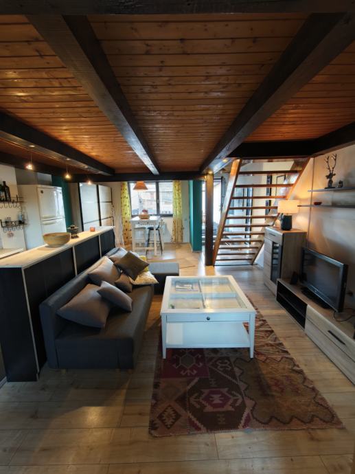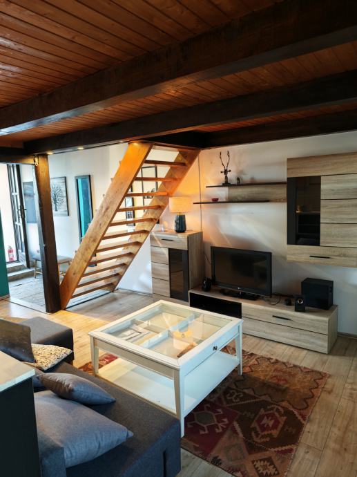 Iznajmljuje se prekrasan stan u samom centru grada, ukupne površine 57 m² (45 m² donja etaža + 12 m² galerija), smješten u potkrovlju kuće. Stan odiše posebnim šarmom zahvaljujući vidljivim drvenim gredama i toplim drvenim detaljima koji stvaraju ugodnu i opuštajuću atmosferu.
