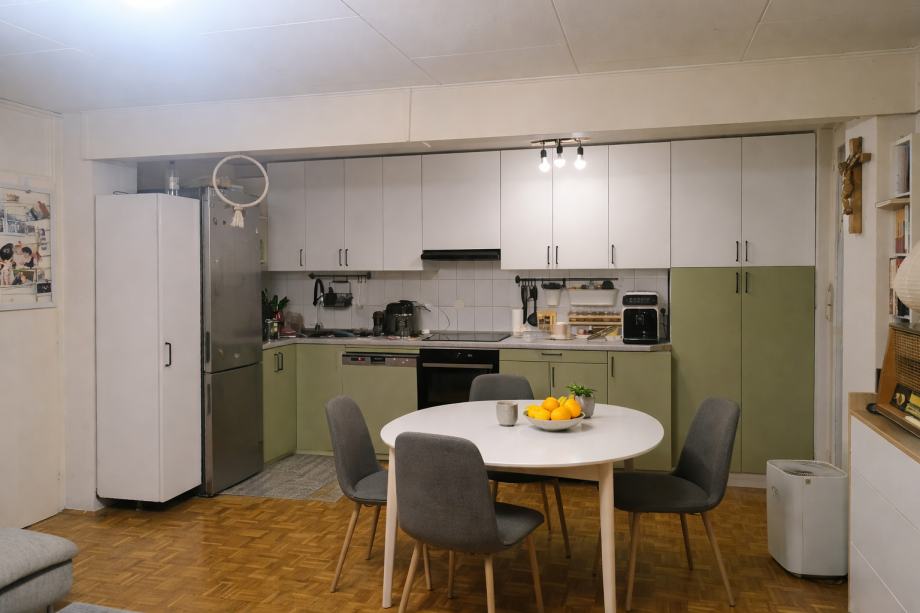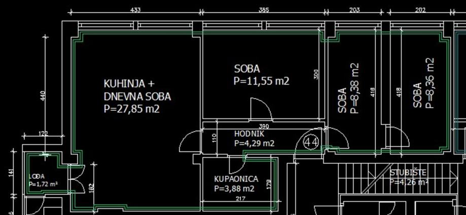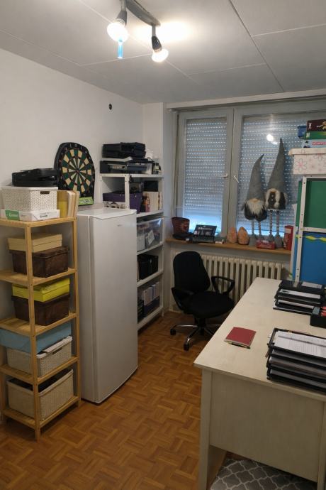 Stan se sastoji od dnevnog boravka, kuhinje, lođe, hodnika, kupaonice s WC-om, spavaće sobe i dvije dječje sobe.