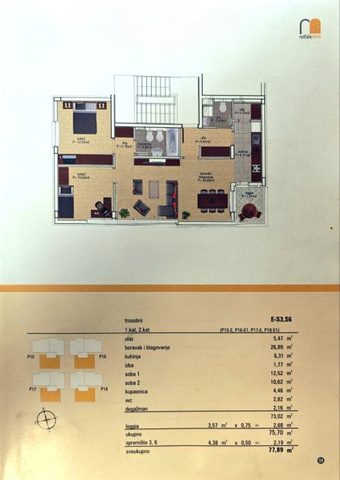 Svijetao, trosoban stan u naselju Retfala Nova, na prvom katu. Stanu pripada i korisno podrumsko spremište. Uredno održavan, prodaje se namješten. Blizina škole, vrtića, javnog prijevoza, trgovačkih centara i drugih sadržaja, prometno odlično povezan s ostatkom grada, u blizini zapadnog izlaza na osječku obilaznicu. Mirna i poželjna lokacija za život u Osijeku. Uredno vlasništvo, bez tereta.