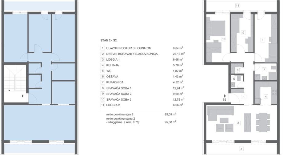 - prvi kat ( stan broj 2 ) – 95,08 m2
