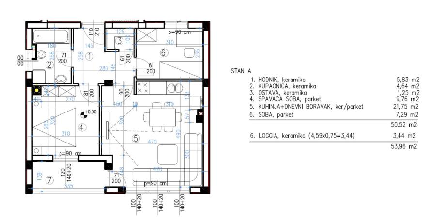 Stan se sastoji od hodnika, dnevnog boravka sa kuhinjom, dvije spavaće sobe, kupaonice, ostave i zatvorene lođe (loggia).