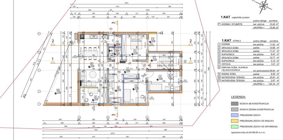Stan ukupne stambene površine 130,16 m2 se sastoji od hodnika, 3 spavaće sobe, 2 kupaonice, ostave, dnevne sobe s blagovaonicom i kuhinjom, radne sobe i 2 balkona od kojih je jedan s dvorišne, a drugi s ulične strane.