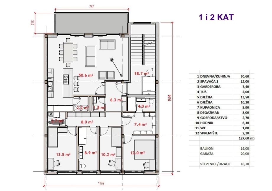 Svi stanovi su po 127,60 m2 te se sastoje od dnevnog boravka, blagovaonice i kuhinje otvorenog koncepta, tri spavaće sobe, wc-a, kupaonice, ostave, garderobe, hodnika, spremišta i terase.