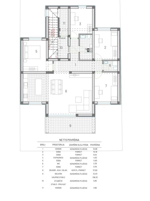 Stan ukupne stambene površine 108,32 m2 sastoji se od hodnika, dnevne sobe s blagovaonicom i kuhinjom (open space koncept) te izlazom na balkon, ostave, 4 sobe, kupaonice i wc-a.