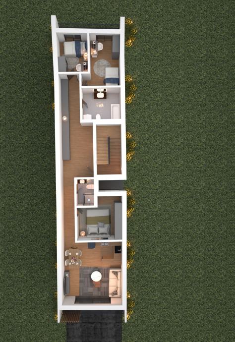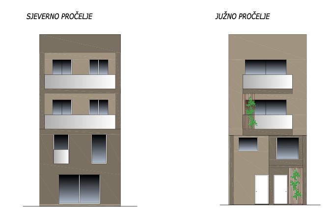 Na 2. katu 4-sobni stan od 87 m2 sastoji se od: hodnika sa ostavom, dnevnog boravka sa kuhinjom i 2 kupatila, 3 spavaće sobe, balkonima prema ulici 5 m2 i dvorištu 5 m2.