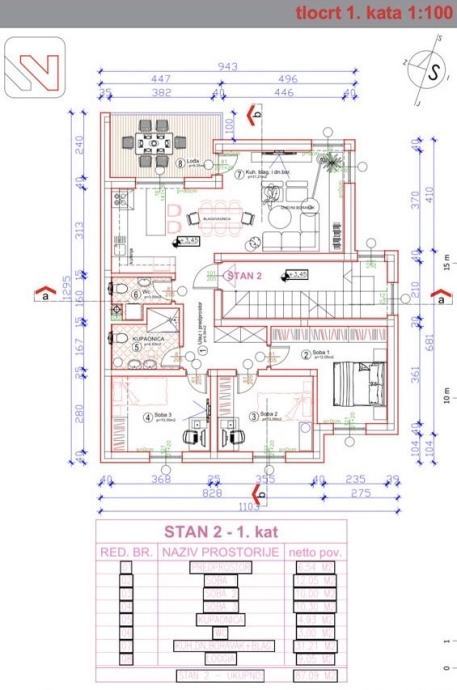 Stan ukupne stambene površine 87,09 m2 sastoji se od dnevnog boravka s blagovaonicom i kuhinjom (open space koncept) te izlazom na loggia-u, 3 sobe, kupaonice, toaleta i predsoblja.