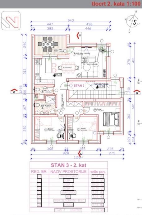 Stan ukupne stambene površine 87,09 m2 sastoji se od dnevnog boravka s blagovaonicom i kuhinjom (open space koncept) te izlazom na loggia-u, 3 sobe, kupaonice, toaleta i predsoblja.