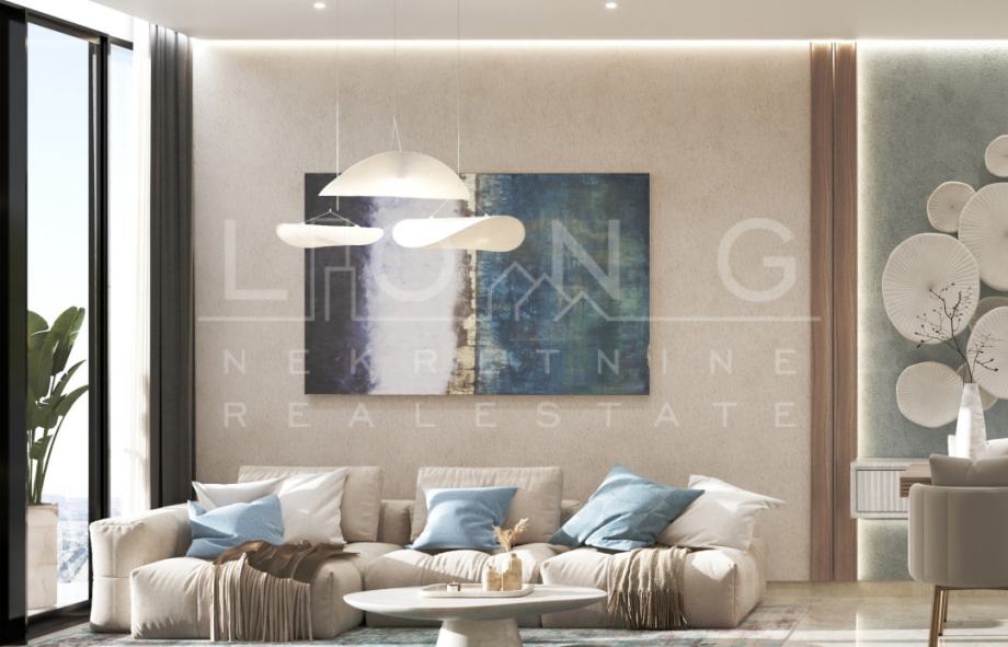 Apartman površine 40,15 m2 nalazi se na 15 katu moderno dizajnirane zgrade, sastoji se od ulaznog dijela, kupone, kuhinjskog, dnevnog i spavaćeg prostora sa bazenom i balkonom.