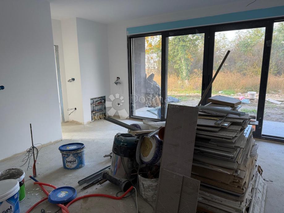 Prodaje se elegantan i funkcionalan stan modernog dizajna u prizemlju novogradnje, s velikim aluminijskim staklenim stijenama i toniranim staklima, električnim roletama u antracit boji te štedljivim sustavom dizalice topline za grijanje i klimatizaciju što znatno smanjuje troškove održavanja. Protuprovalna vrata i moderna fasada od opeke dodatno osiguravaju sigurnost i stil. Visina stropa je 3m, što je više od standarda gradnje. Stan također ima podno grijanje i ugrađenu klimu.