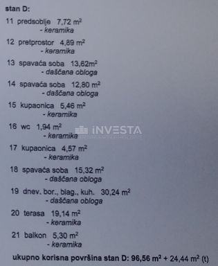 Stan D nalazi se na prvom katu zgrade te je ukupne stambene površine 96,56 m2. Sastoji se od predsoblja, predprostora, 2 kupatila, dodatnog toaleta, 3 spavaće sobe od kojih jedna ima vlastiti balkon te dnevnog boravka s kuhinjom i blagovaonom po open space konceptu sa izlazom na prostranu terasu s jacuzzijem.