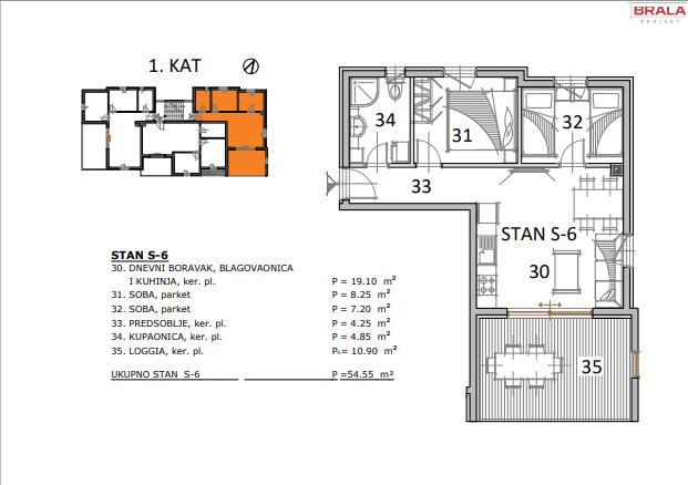 Prodaje se prekrasan trosoban stan M-S-6 obračunske površine 54,55 m2 na prvom katu visokokvalitetene moderne zgrade od dva kata i potkrovljem u izgradnji s ukupno 8 stanova i 2 apartmana, a koji se sastoji od dnevnog boravka s kuhinjom i blagavaonom, dvije spavaće sobe, kupaonice s WC-om i lođom(Loggia).