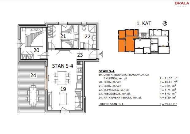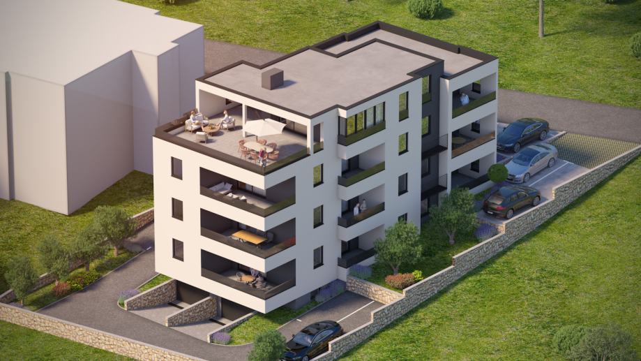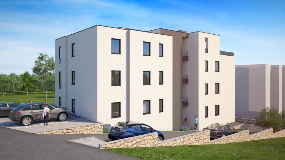Prodaje se prekrasan trosoban stan M-S-4 obračunske površine 59,40 m2 na prvom katu visokokvalitetene moderne zgrade od dva kata i potkrovljem u izgradnji s ukupno 8 stanova i 2 apartmana, a koji se sastoji od ulaznog hodnika, dnevnog boravka s kuhinjom i blagavaonom, dvije spavaće sobe, kupaonice s WC-om i natkrivenom terasom.