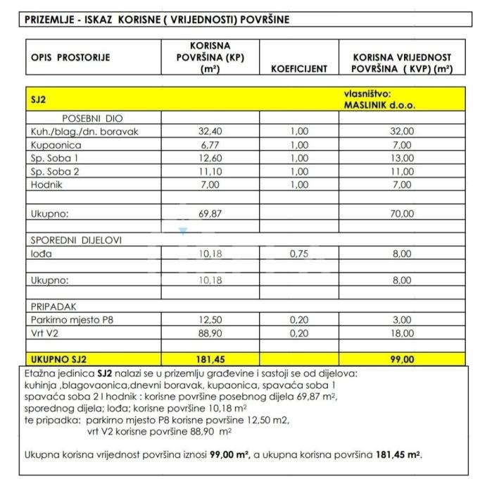 Ukupna korisna vrijednost površina iznosi 99 m², dok ukupna korisna površina s pripadcima iznosi 181 m².