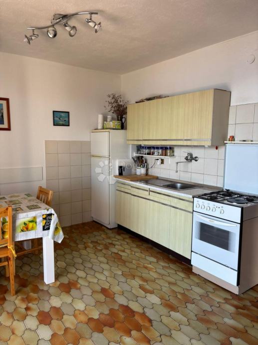 U stan se ulazi iz dvorišta, gdje se nalazi suterenski dio sa spremištem i ostavom. Vanjsko stepenište vodi u prizemlje u kojem Vas dočekuje toplo uređen prostor: hodnik, kuhinja s blagovaonicom i dnevnim boravkom iz kojeg se kroz velika staklena vrata izlazi na terasu. S nje se pruža neopisivo lijep, panoramski pogled na more i obližnje otoke – prizor koji oduzima dah i stvara osjećaj potpune slobode.