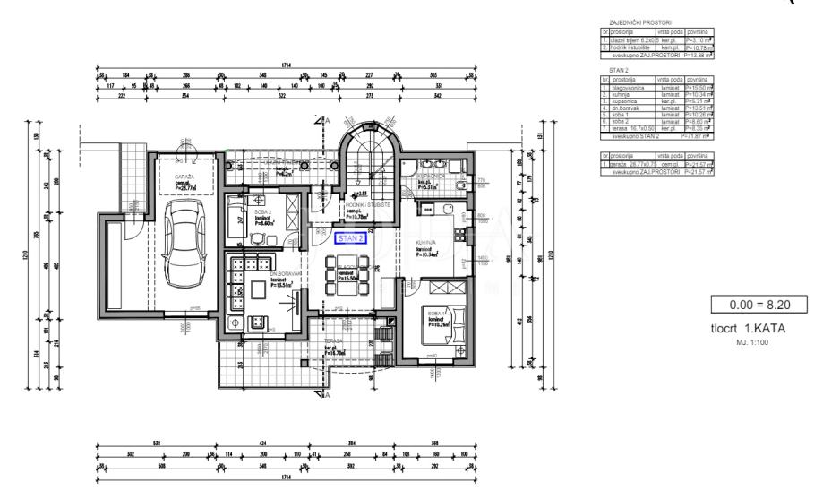 Nalazi se na prvom katu sa južne strane tako da ima lijepi pogled na more,dok je sa ulazne strane u razini ceste pa pruža mogućnost lganog ulaza i za ljude slabijeg kretanja.