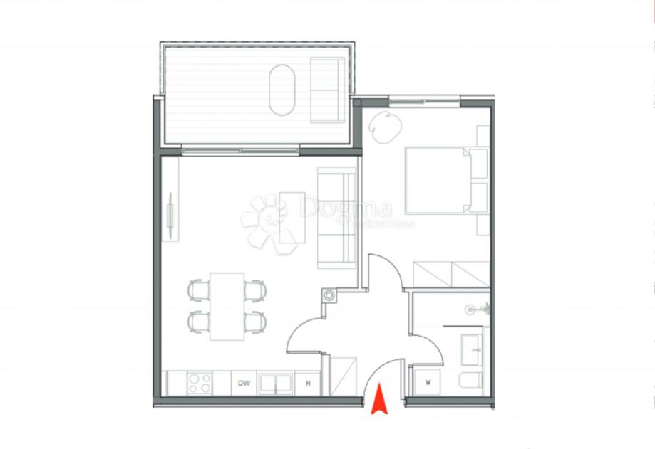 Sastoji se od ulaznog prostora, kupaonice, spavaće sobe, te prostranog dnevnog boravka s kuhinjom i blagovaonom.