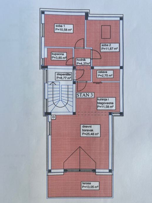 - ulazni hodnik, kupaonica sa wc-om, dnevni boravak / kuhinja / blagovaona, 2 x spavaća soba, terasa,