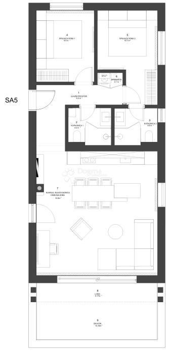 Penthouse SA5, neto površine 122,47 m², donosi komfor i privatnost na najvišoj razini. Dnevni boravak s kuhinjom i blagovaonicom (33,80 m²) otvara se prema loggii (5,17 m²) i balkonu (10,16 m²), dok dvije spavaće sobe (9,50 m² i 10,70 m²) osiguravaju miran odmor. Dvije kupaonice, hodnik i spremišta dodatno naglašavaju funkcionalnost.