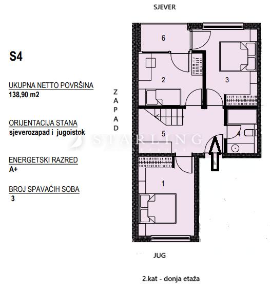 Prodaje se četverosoban stan površine 142 m2 na drugom/trećem katu stambene zgrade sa liftom. Stan se proteže na dvije etaže, a na drugu etažu (3.kat) se ulazi direktno iz lifta.