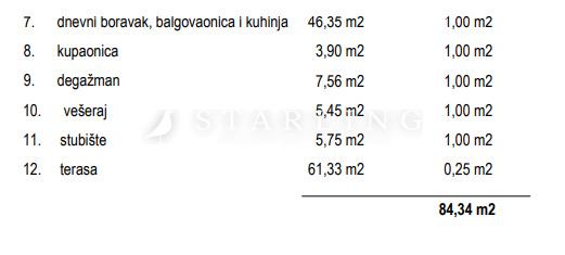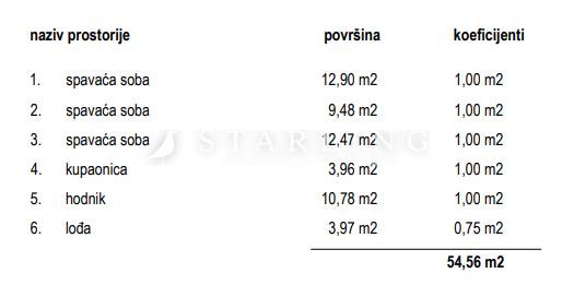 Stan se sastoji od dnevnog boravka, blagovaonice, kuhinje, 3 spavaće sobe, 2 kupaonice, nenatkrivene terase te spremišta u prizemlju.