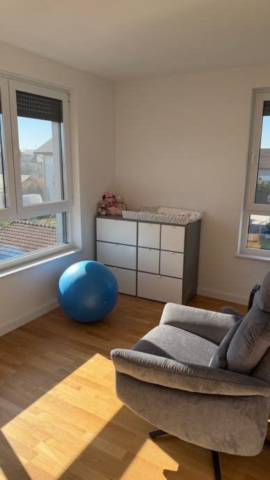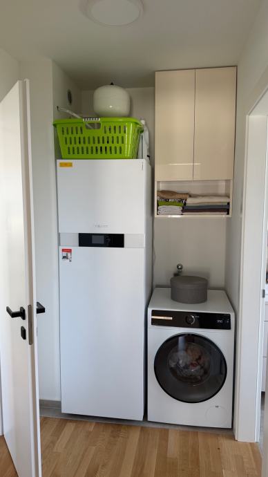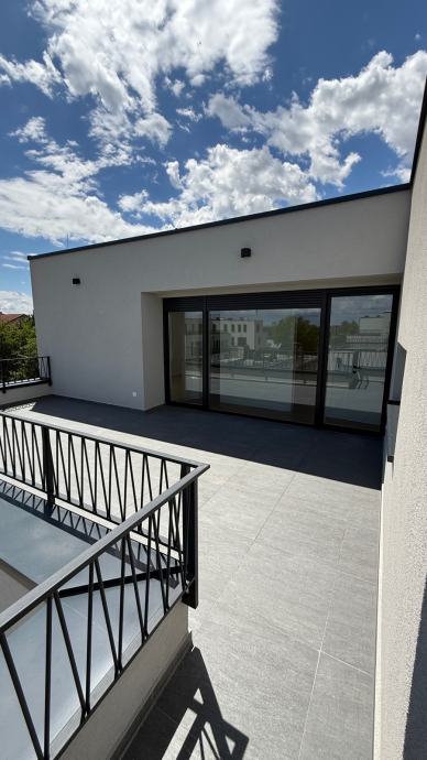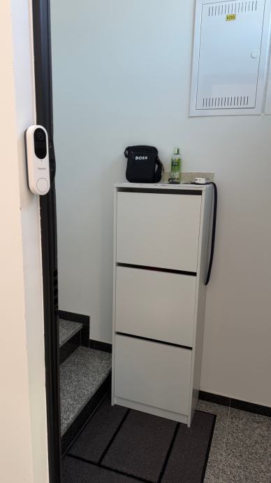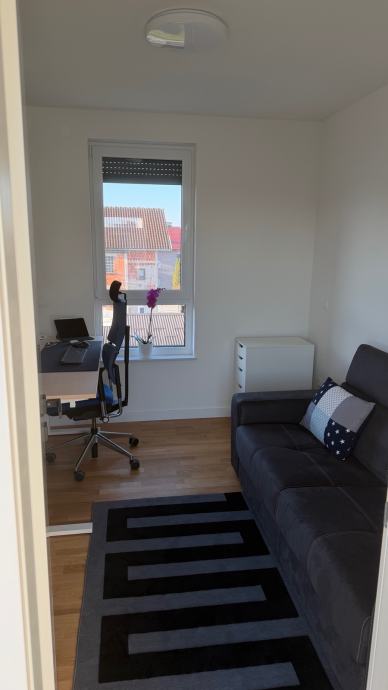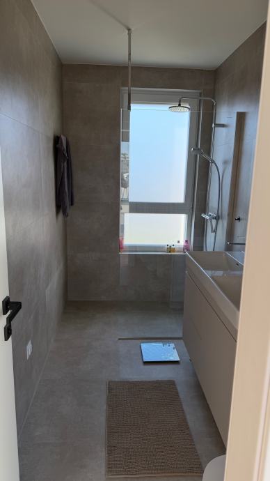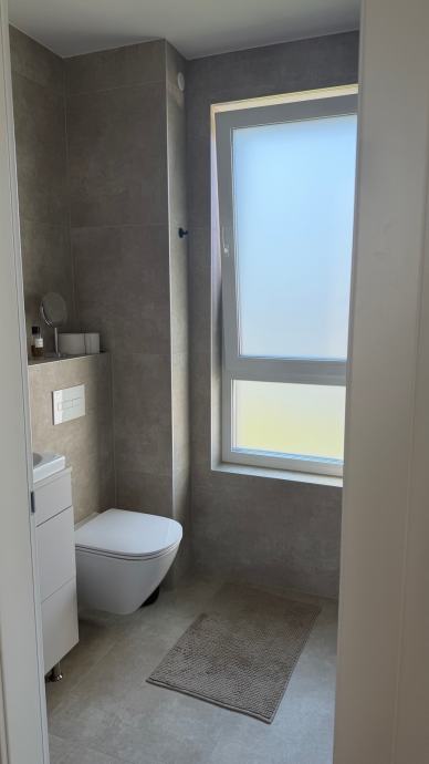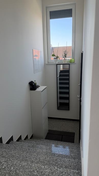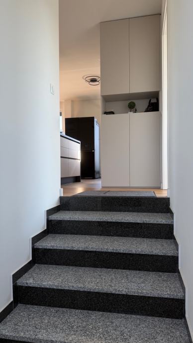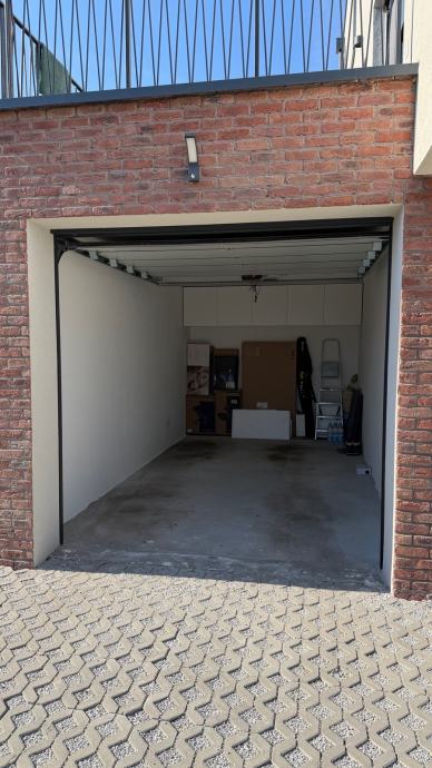 Stan na vrhu zgrade u maloj zgradi sa 4 stana sa garazom (na slici lijevo) I vanjskim nenatkrivenim parkirnim mjestom (nasuprot garaze) i spremistem.
