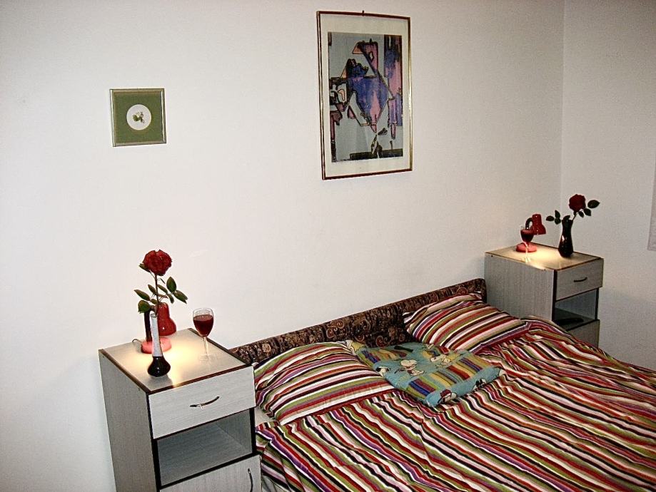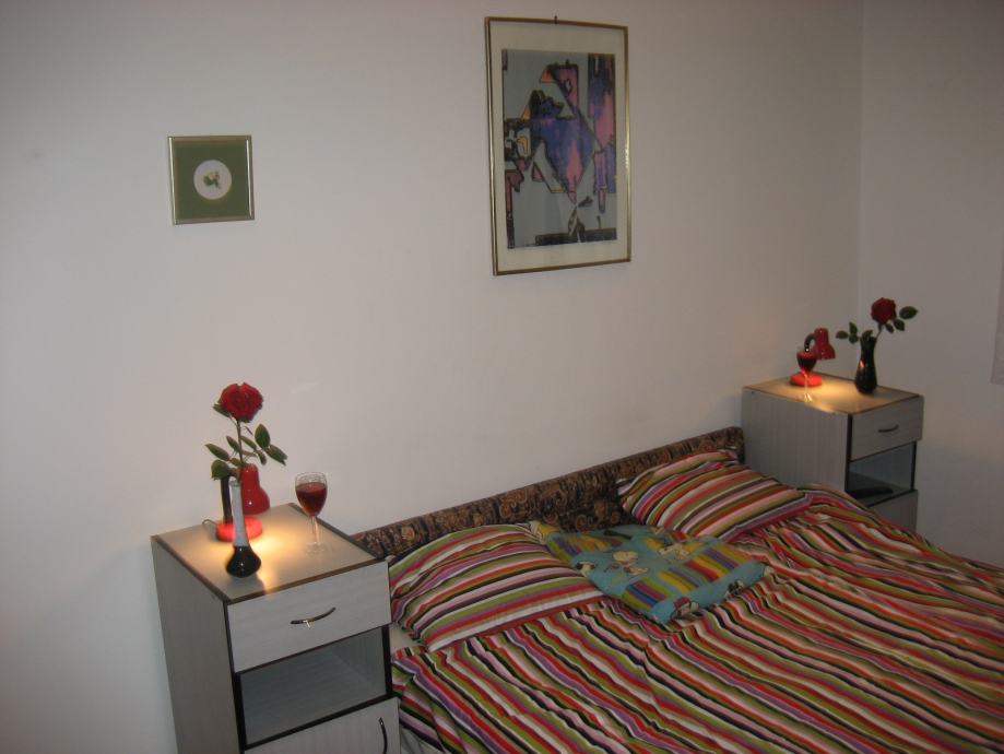 Zasebna spavaća soba sadrži "king size 180/210" ručno rađeni dupli krevet sa noćnim ormarićima i lampama, mali TV i stolić, ogromni trokrilni ormar sa duplim vješalicama i ladicama te slike i ogledalo.