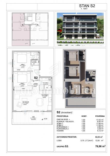Stan S2 površine 76.66 m2 zauzima pola prvog kata. Sastoji se od dvije spavaće sobe, dvije kupaonice, hodnika, kuhinje, blagovaonice, dnevnog boravka i prostrane loggie površine 17,24 m2. Stan ima otvoreni koncept unutarnjeg dizajna gdje kuhinja, dnevni boravak i terasa tvore jedinstvenu cjelinu, pa se pogled na more pruža iz većeg dijela stana. Pogled na more iz ovog stana nije moguće zagraditi s obzirom na to da gleda preko već izgrađenih zgrada.