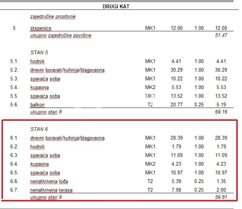 Prodaje se stan u kvalitetnoj novogradnji s pogledom na more u Novigradu. Stan se nalazi na drugome katu stambene zgrade te se sastoji od 2 spavaće sobe, loggie, dnevnog boravka, kuhinje, kupatila i terase s koje se proteže pogled na more. Jedna od spavaćih soba ima i izlaz na nenatkrivenu loggiu. Neto korisna površina stana je 59,81 m. Zgrada se sastoji od 8 stanova te se gradi kvalitetnom poroterm ciglom. Fasada je energentska sa termoizolacijom debljine 8 cm.