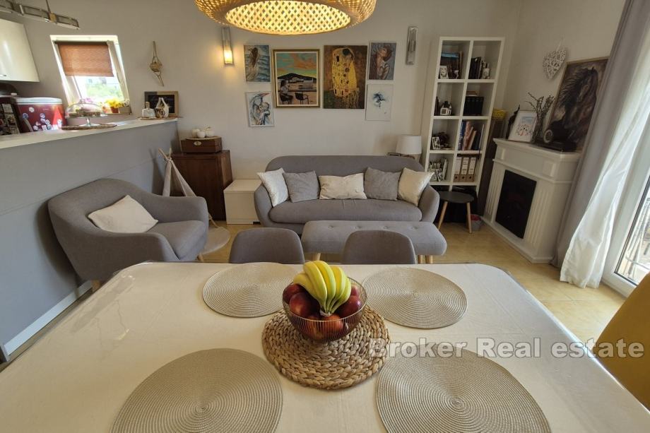 Prodaje se stan na prvom katu kuće, smješten u mirnom okruženju blizu mora, idealan za obiteljski život ili turizam. Stan se sastoji od hodnika, kuhinje i dnevnog boravka, WC-a i dvije sobe, sveukupne korisne površine 75,72 m². Stanu pripada balkon položen na jugu, površine 4,30 m², savršen za uživanje u sunčanim danima.