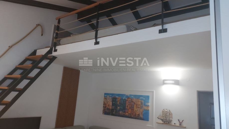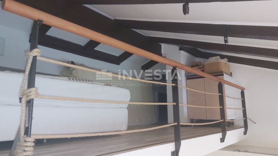 Stan se nalazi na 3. katu te ima 30 m² stambene površine uz dodatnih 14 m² galerije, što prostoru daje dodatnu funkcionalnost i prozračnost. Sastoji se od dnevnog boravka, kuhinje, zatvorene prostrane lođe s prekrasnim pogledom na marinu, kupaonice te jedne spavaće sobe.