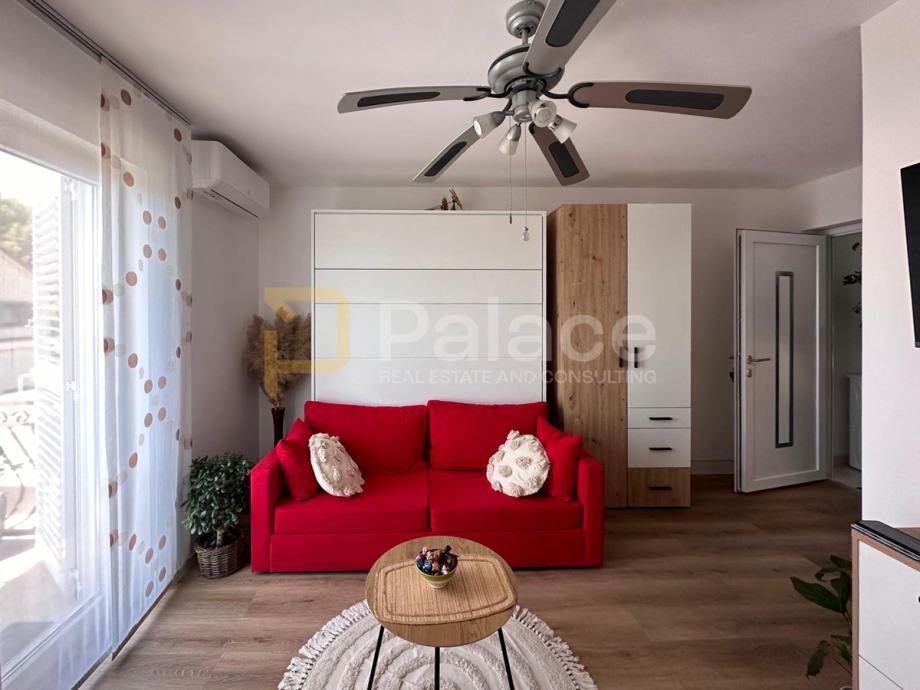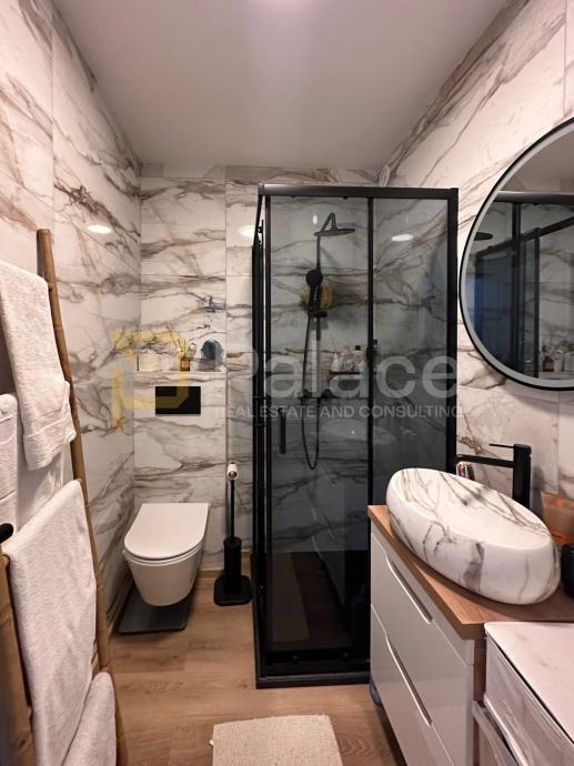 Podijeljen je u dvije jedinice, od kojih je jedna manja potpuno sređena i useljiva i sastoji se od kupaonice, blagovaonice s dnevnim boravkom i balkona s kojeg se pruža prekrasan pogled na more. Drugi dio stana je u procesu opremanja te se sastoji od jedne spavaće sobe s balkonom, kupaonice, hodnika, kuhinje i dnevnog boravka s balkonom s kojeg se također pruža pogled na more. Postoji mogućnost kupnje samo većeg dijela stana s garažom. Dodatne slike na upit.