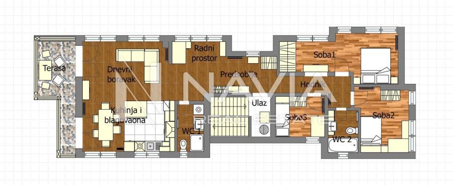 Raspored: 3 spavaće sobe, 2 kupaonice s WC-om, hodnik, kuhinja s blagovaonicom i dnevnim boravkom, terasa, kotlovnica