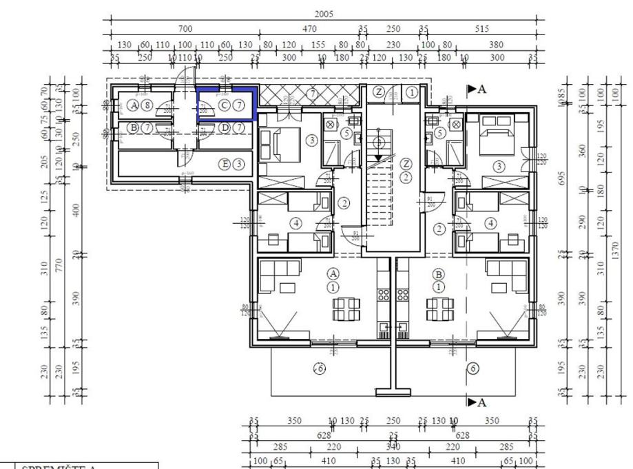 Stan C na prvom katu, neto površine 65,85m2 ( hodnik, dvije spavaće sobe od kojih jedna ima svoju terasu, kupatilo sa prozorom, kuhinja sa dnevnim boravkom i terasa ) , spremište u prizemlju 3,25 m2 .