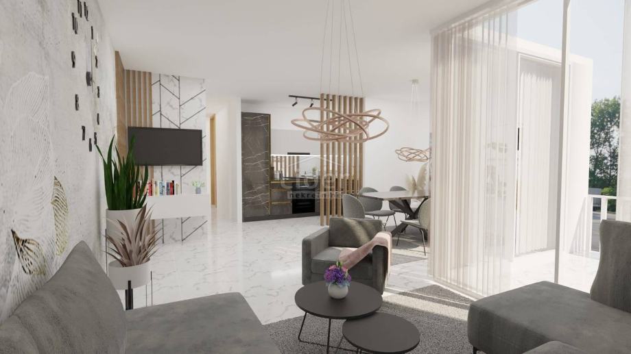 Stan se sastoji od: dnevnog boravka, kuhinje i blagovaone, jedan WC i dvije kupaone, od kojih jedna pripada spavaćoj sobi.