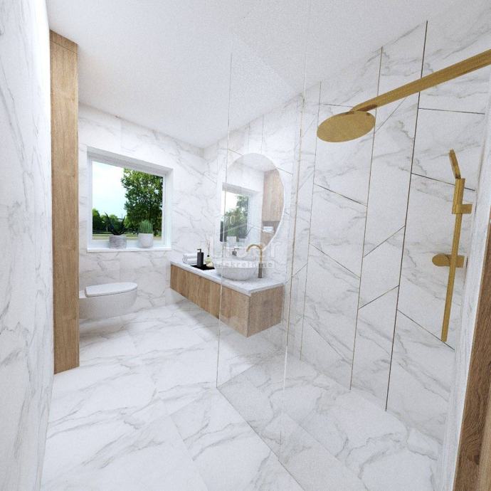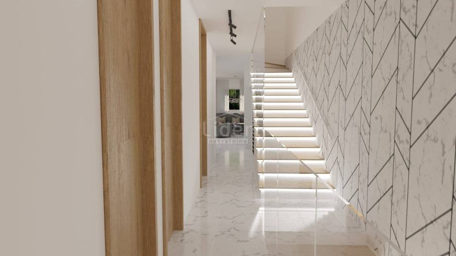 Na prvom se etaži nalaze prostrani dnevni boravak, kuhinja i blagovaona, balkon od 8m2, dvije kupaone, WC i dvije spavaće sobe od kojih jedna ima vlastitu kupaonu.