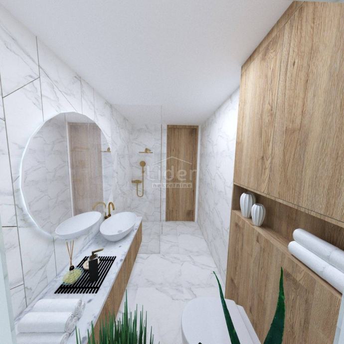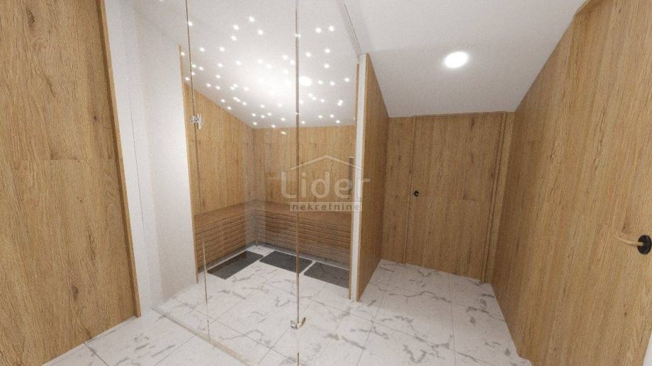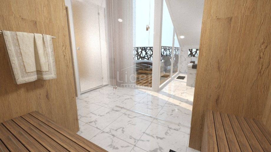 Na drugoj se etaži nalazi prostor od 17m2 gdje se nalazi sauna i jedan tuš i WC + 20 m2 terase gdje se smjestio jacuzzi s predivnim pogledom na more i alpe u daljini.