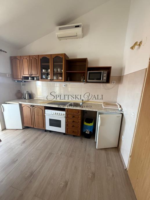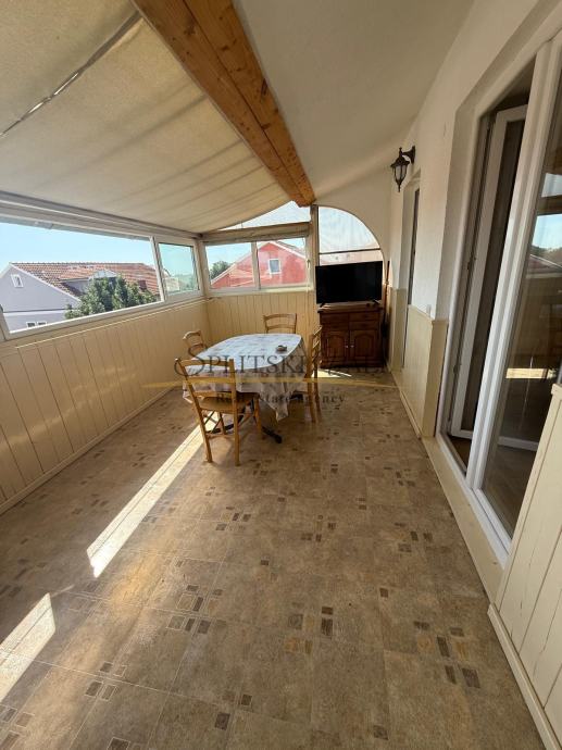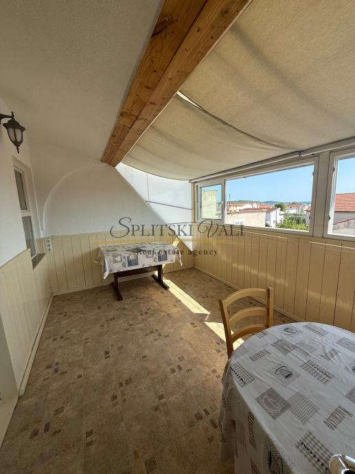 Prodaje se stan u Vodicama, udaljen svega 250 metara od mora, smješten u potkrovlju kuće s tri odvojena stana i prekrasnim pogledom na more. Nalazi se u mirnoj ulici te se sastoji od dvije spavaće sobe s kupaonicama, prostranog dnevnog boravka s kuhinjom i blagovaonicom, natkrivene i ostakljene terase, dodatne kupaonice, hodnika sa stubištem, dvije ostave i tri galerije ukupne površine 71,28 m². Stanu pripadaju i stepenice, balkon, lođa te parkirno mjesto, a ukupna korisna površina iznosi 89 m².