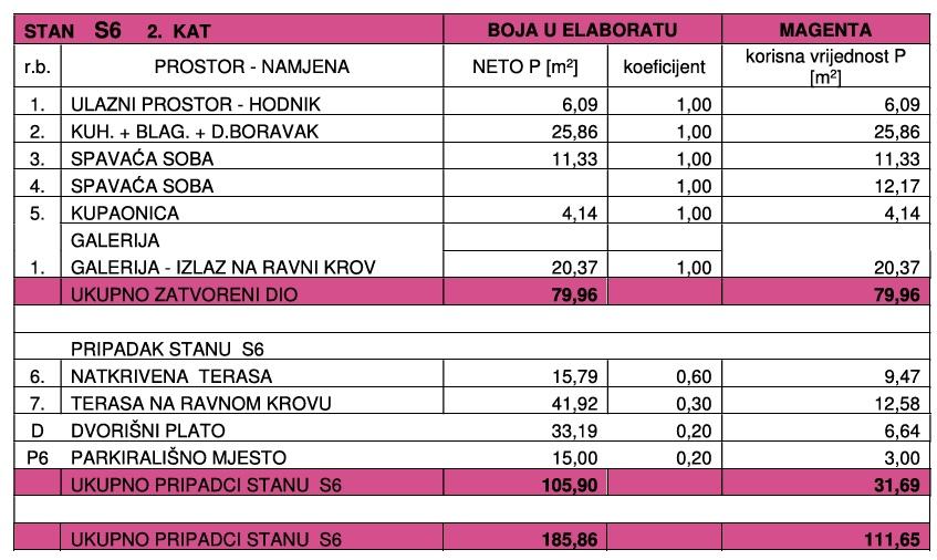 Unutrašnji stambeni prostor 79,96 m2 – prostrani dnevni boravak i kuhinja, 2 spavaće sobe, 2 kupaonice, hodnik i soba na galeriji. Natkrivena terasa površina 15,79 m2 i velika krovna terasa 41,92 m2 dijelom natkrivena pergolom, dvorišni plato 33,15 m2 za 2 parkirna mjesta te još jedan parking, videonadzor…