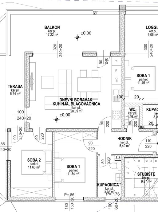 dnevnog boravka/blagovaone/kuhinje:28.09m2