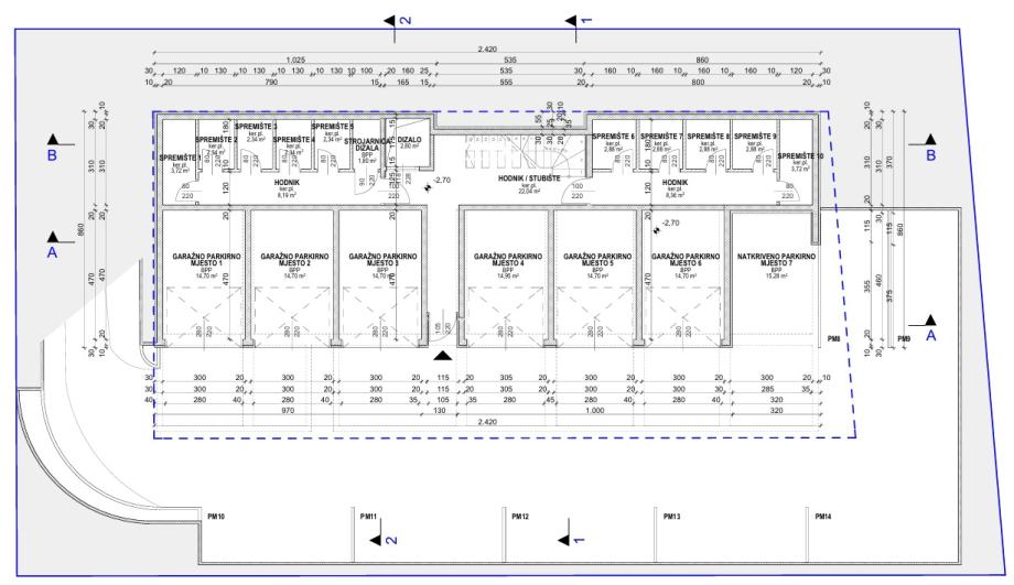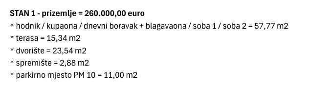 Propadaju mu dvorište 23,54 m2, spremište u podrumu 2,88 m2 i parkirno mjesto PM10, površine 11,00 m2.