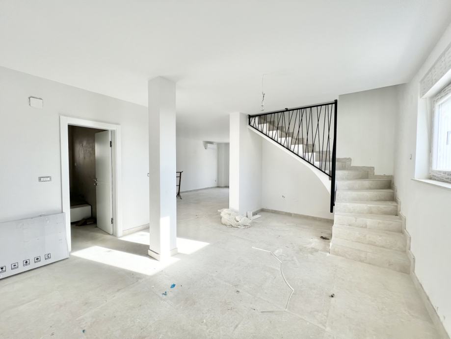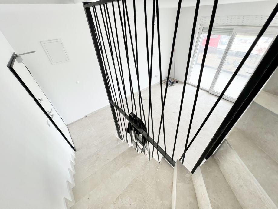 Na prvoj etaži nalazi se veliki ulazni prostor, kupaonica s wc-om, open space kuhinja, blagovanje, dnevni boravak s izlazom na natkrivenu terasu i vrt, dok su na drugoj etaži dvije spavaće sobe s izlazom na natkrivenu terasu i kupaonica s wc-om.