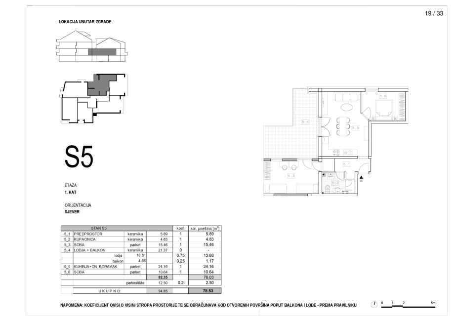 Stanu pripada parkirno mjesto. Stan ima PVC stolariju sa termičkim mostom i troslojnim staklom, ulazna vrata protuprovalna i protupožarna po certifikatu EI 30-CSm, predviđeni energecki certifikat A/A+ .