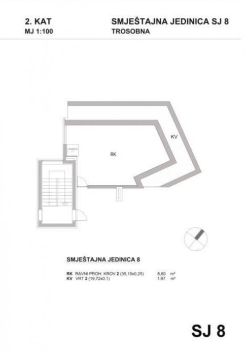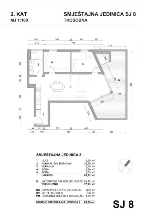 Ukupna stambena površina 63,13 m2,krovna terasa 8,80 m2,balkona 14,10 m2 i vrtom 1,97 m2 čine čine nekretninu sveukuno 89,97 m2.