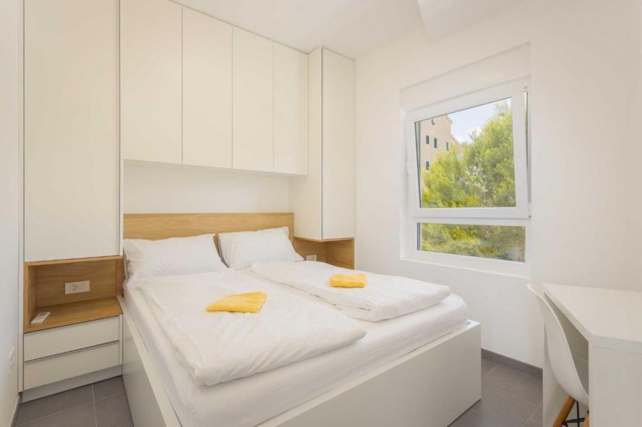 Stan se nalazi na mirnoj lokaciji i u blizini svih potrebnih sadržaja na nekoliko minuta laganog hoda do prvih plaža.