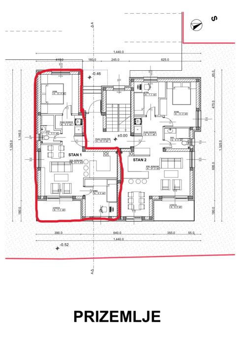 Stan S1 se sastoji od ulaznog hodnika, koncept open space dnevnog boravka, kuhinje i blagavaonice, dvije spavaće sobe, kupaonice te loggie. Stanu prirpada jedno vanjsko parkirno mjesto te izlaz na vrt.
