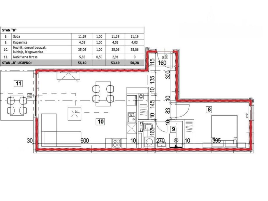 Stan korisne površine 53,19 m2 sastojati će se od hodnika, dnevnog boravka, kuhinje, blagovaonice, spavaće sobe, kupaonice te natkrivene terase.