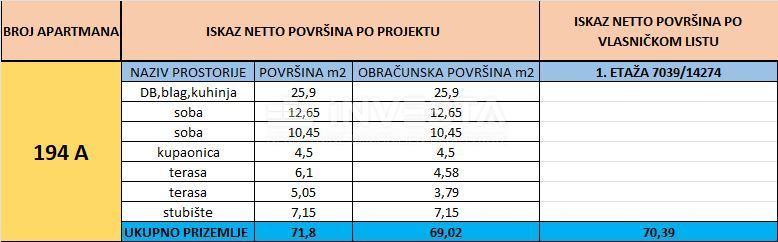 Stan 194A ima ukupnu neto površinu od 70,39 m² i sastoji se od ulaznog prostora, kupaonice, dvije spavaće sobe s izlazom na zajedničku terasu, te dnevnog boravka s kuhinjom i blagovaonicom s izlazom na drugu terasu. Također ima pripadajući vrt i parkirno mjesto. Stan je opremljen PVC stolarijom i klimatskom jedinicom, te se prodaje potpuno opremljen i spreman za korištenje.