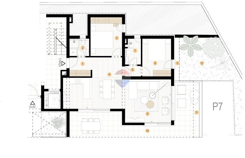 Stan se sastoji od ulaznog prostora, dvije spavaće sobe, dvije kupaonice, kuhinje s blagovaonicom, dnevnog boravka, terase koja pruža prostor za boravak i uživanje na otvorenom i vrta.